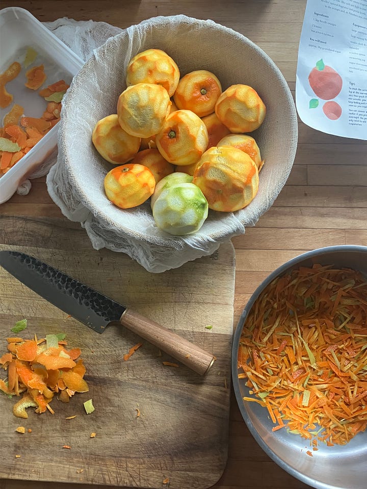 The sweet scent lingered as I sliced and sliced until I had a bowlful of orange strands. Into the pan they went as I started squeezing the juice through a muslin from the thick, pithy oranges – squeezing the juice straight into my eyes more than once.