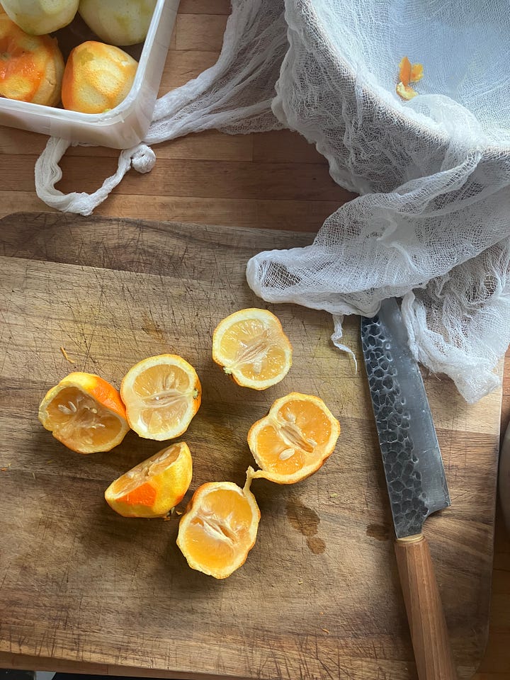 In previous years when a craving for the bittersweet has hit, I have struggled to find Seville oranges anywhere. This year, my veg box was offering big bags of them for marmalade-making, so I added them to my basket quickly before they were out of stock again. I love the ritual of these microseasons being so fleeting, knowing there is prime produce that could simply pass me by again until next year.